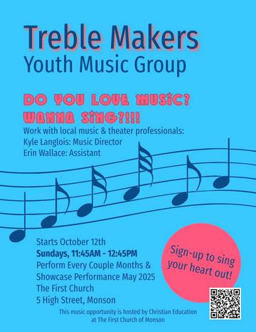 This month I became the new Music Director for the Treble Makers Youth Music Group in Monson. This is a fun music group where kids in grades 6 to 12 will have a chance to express themselves, learn, and perform. This is a free program to anyone in the Monson community or surrounding towns. I'm very excited to be working with the very talented Erin Greene Wallace once again!